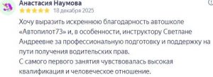 Хочу выразить ОГРОМНУЮ БЛАГОДАРНОСТЬ автошколе «АВТОПИЛОТ 73»!!!Обучение проходило на высшем уровне, с Татьяной Владимировной каждая лекция была понятной, комфортной, информационной, увлекательной,чёткой на 💯👌👍