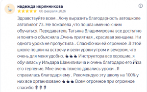 Хочу выразить огромную благодарность автошколе «Автопилот 73», в особенности преподавателю Татьяне Владимировне и инструктору Александру Николаевичу. Их профессионализм, терпение и умение объяснять материал сделали процесс обучения максимально комфортным и эффективным. Благодаря им я уверенно сдал все экзамены с 1 раза . Большое спасибо за ваше внимание и поддержку!