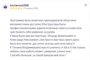 Выражаю благодарность преподавателю теории Татьяне Владимировне, чётко донесла всю информацию и помогла разобраться в сложных вопросах. Ну и конечно хочу поблагодарить инструктора Александра Анатольевича, спокойно и без нервов всё объяснил, научил с нуля, за что очень благодарна! Очень рекомендую, рада, что обратилась именно к Вам!